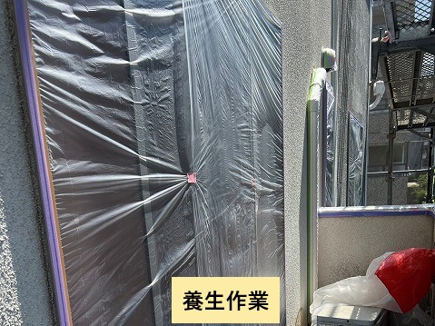 まずは、サッシ・玄関ドア・窓・エアコン配管など、塗料が付着してはいけない部分をしっかり養生します。