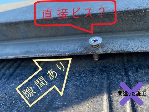 実際に点検したケースでは、棟板金のビスが上から打たれていました。