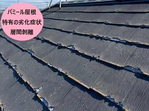 パミール屋根は、1990年代後半〜2000年代初頭に多く使われた屋根材で、築15〜20年ほどで表面がミルフィーユに剥がれてしまうという特徴があります。